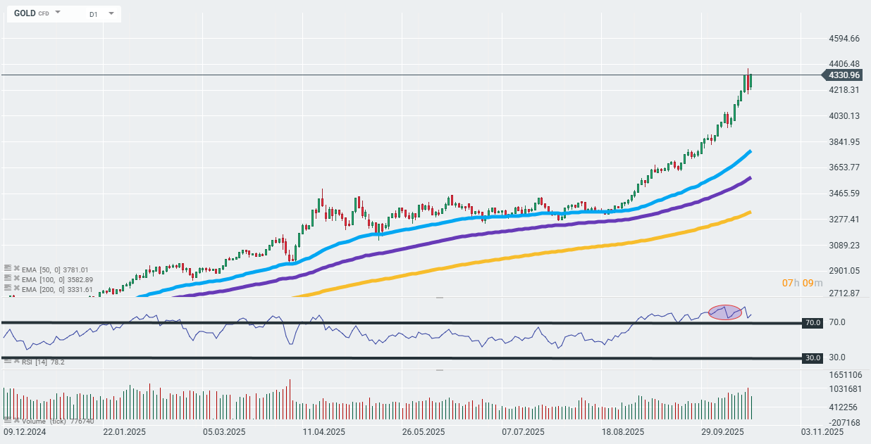 Zlato se vrací k nedávným historickým maximům. RSI pro 14denní průměr na denním intervalu (D1) zůstává nad 70 body. Zdroj: xStation