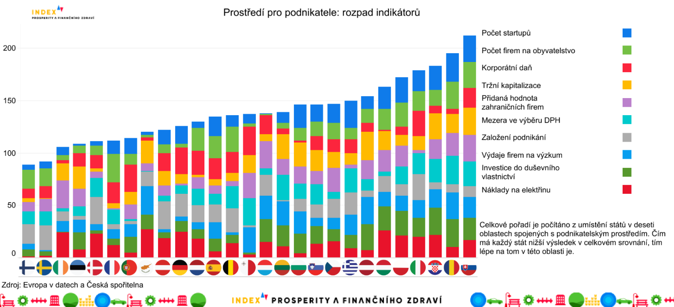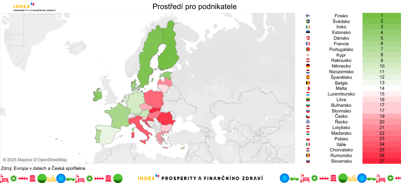 Podmínky pro podnikatele se v Česku od předchozího ročníku Indexu prosperity a finančního zdraví mírně zlepšily, vystoupali jsme o tři příčky na 19. pozici v EU. Stojí za tím zejména „zkrouhnutí“ mezery ve výběru DPH. Přestože v Česku od loňského ročníku v přepočtu na obyvatele přibylo startupů, stále v tomto ohledu nemáme na většinu unijních kolegů. Český startupový trh trápí nedostatečná robustnost související především s nedostatkem rizikového kapitálu, a Česko se tak globálně řadí mezi desítku zemí s největším odlivem nadějných startupů. Meziroční úspěch tuzemsko zaznamenalo v případě tržní kapitalizace pražské burzy – její podíl na HDP se zvýšil z 16,5 % na 25,8 % HDP, z pohledu unijního pořadí jsme se vyhoupli z 20. na 15. příčku. Lehce se zvýšil také podíl z hrubého fixního kapitálu, který české firmy investují do duševního vlastnictví.