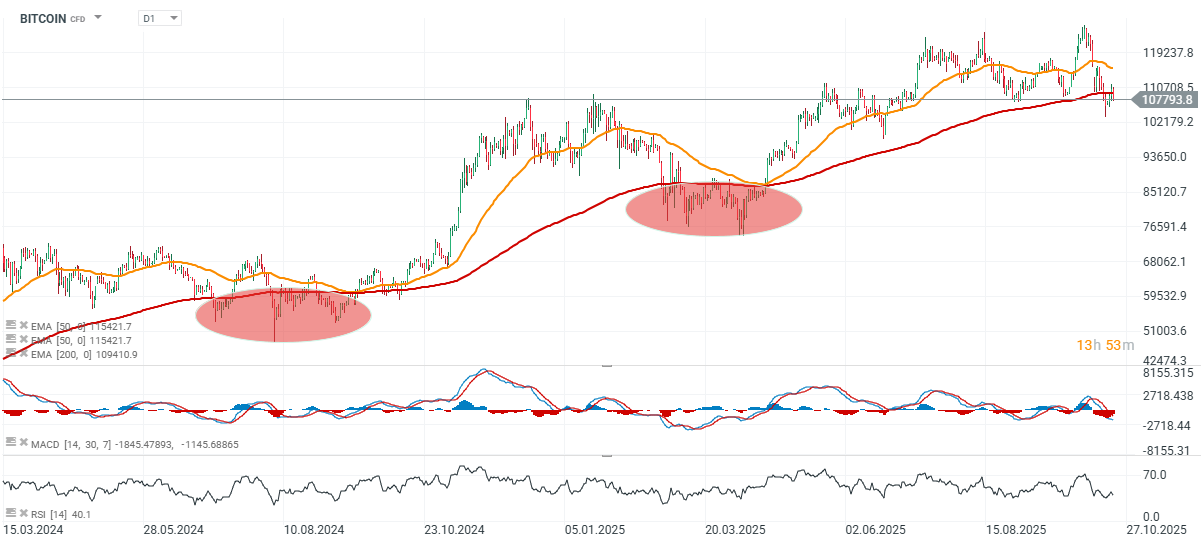 - Navzdory optimistickému tónu na širších trzích bitcoin obnovil svůj pokles a prolomil klíčovou 200denní EMA (červená čára, poblíž 109 500 USD) – což by mohlo signalizovat střednědobou slabost. S ohledem na předchozí korekce podobného rozsahu by pokračující klesající trend mohl realisticky vést k testování klíčové úrovně podpory 100 000 USD.