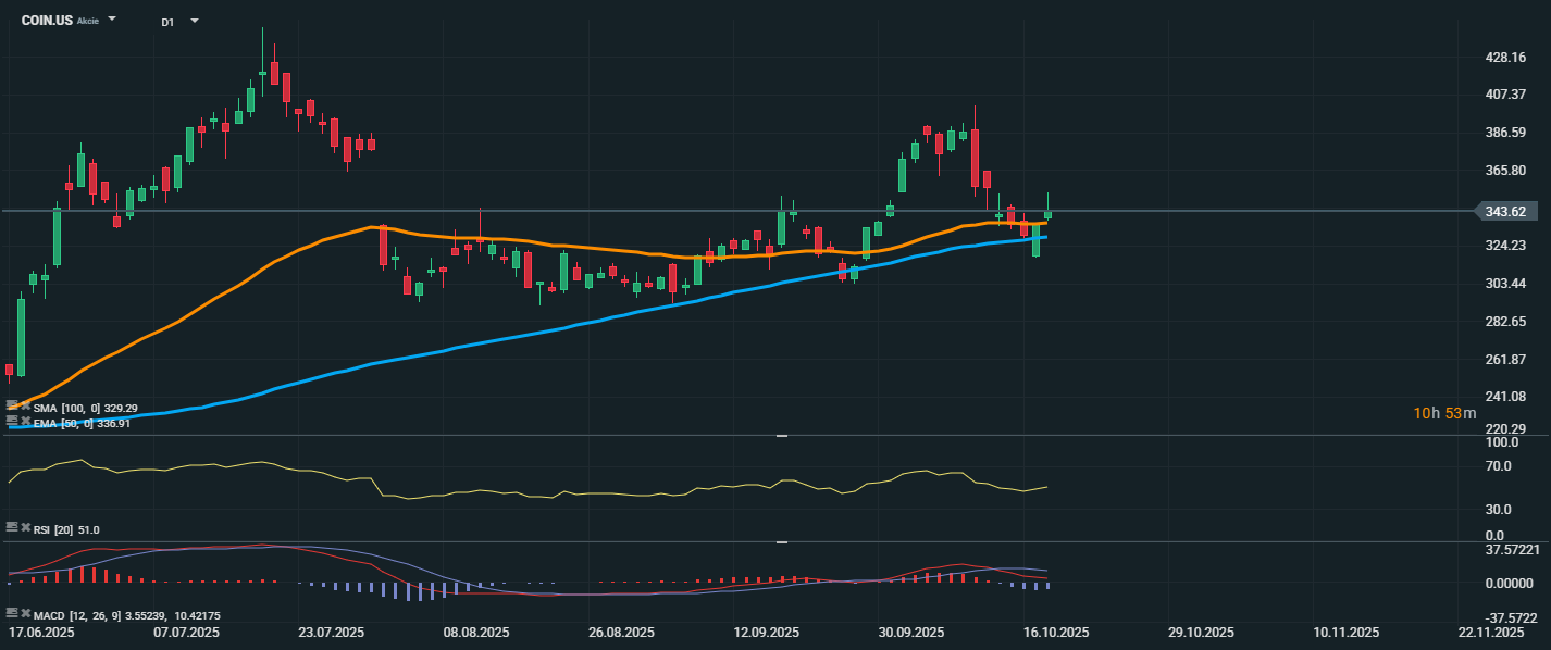 Akcie společnosti Coinbase se aktuálně obchodují na ceně 343,62 USD. Dnešní svíčka prorazila zpět nad klouzavý průměr EMA 50 (336,91 USD) i nad SMA 100 (329,29 USD), což lze vnímat jako pozitivní technický signál a potenciální začátek nového růstového impulsu. RSI se nachází na hodnotě 51,0, což značí neutrální zónu – trh není ani překoupený, ani přeprodaný, a prostor pro růst tak zůstává otevřený. MACD se blíží potenciálnímu býčímu překřížení, zatímco histogram naznačuje postupné oslabování předchozího sestupného trendu.