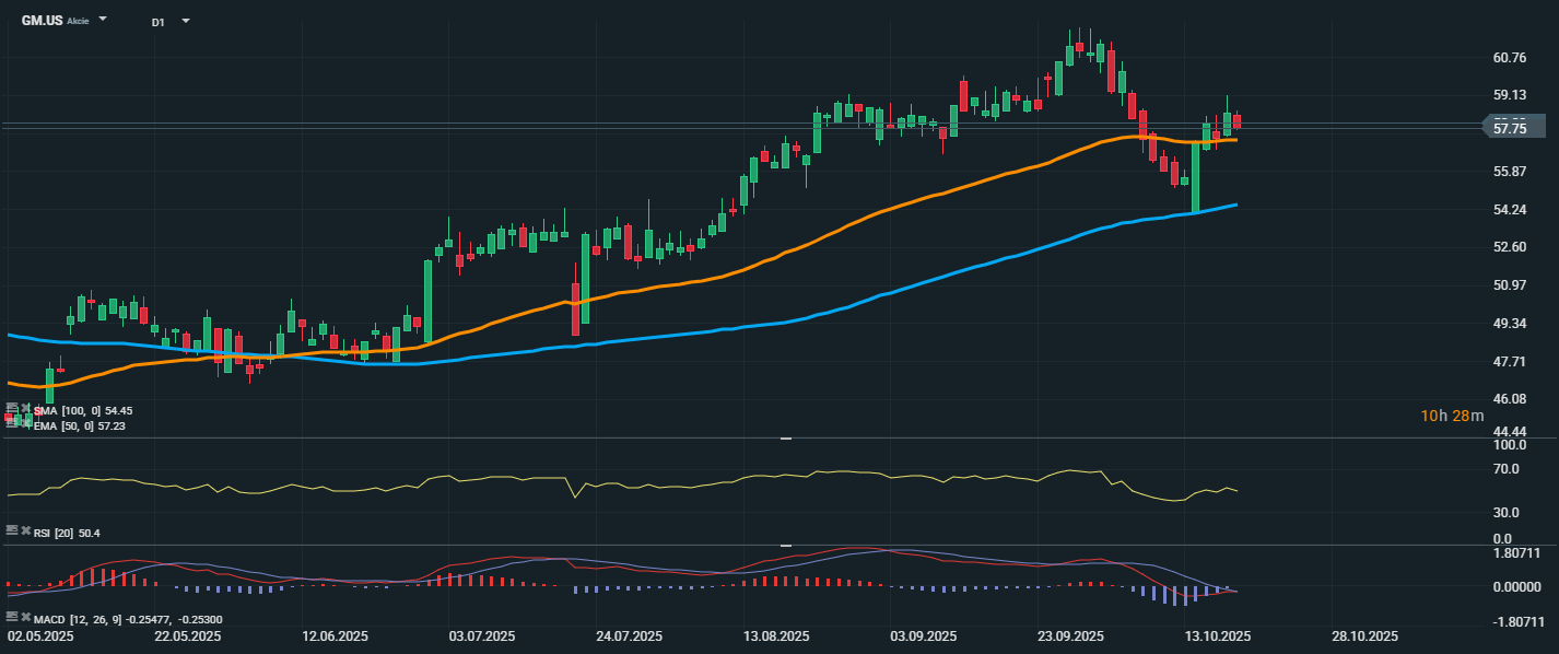 Akcie společnosti General Motors se po nedávné korekci stabilizovaly a aktuálně se obchodují na úrovni 57,75 USD. Krátkodobě došlo k odrazu od SMA 100 (54,45 USD) a cena se vrátila nad EMA 50 (57,23 USD), což je pozitivní technický signál, který potvrzuje obnovený zájem kupců. RSI se nachází na hodnotě 50,4, tedy v neutrální oblasti – bez známek přeprodanosti či překoupenosti. Tento stav naznačuje prostor pro další růst, pokud trh udrží aktuální úrovně.
