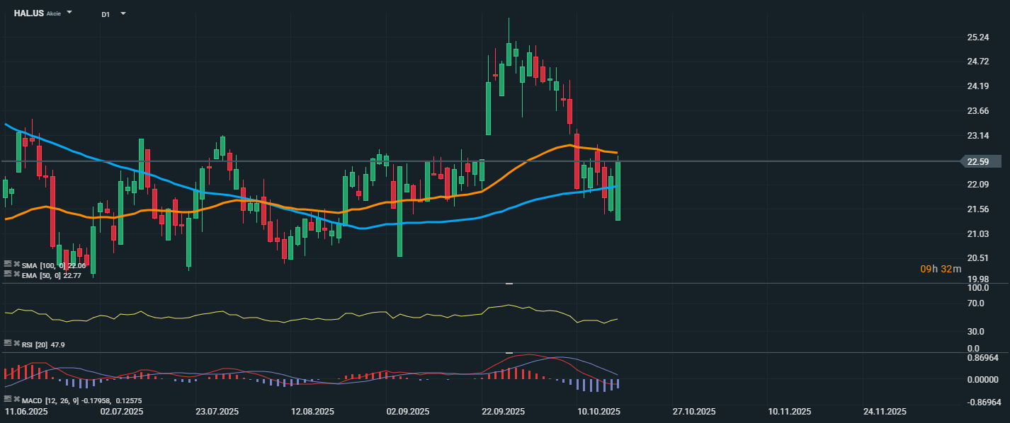 Akcie společnosti Halliburton po výrazném poklesu v předchozích dnech dnes zaznamenaly silný růst a uzavřely na ceně 22,59 USD, čímž prorazily zpět nad EMA 50 (22,77 USD), ale zůstávají těsně pod SMA 100 (23,06 USD), což značí, že technicky stále bojují o návrat do neutrální až pozitivní fáze. RSI se aktuálně nachází na úrovni 47,9, tedy ve středním pásmu, což ukazuje na částečné zotavení, ale stále bez jasného přeprodaného nebo překoupeného signálu.
