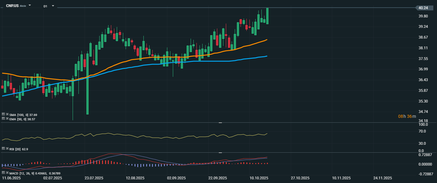 Akcie CenterPoint Energy pokračují v růstovém trendu a aktuálně se obchodují na 40,24 USD. Cena se stabilně drží nad klouzavými průměry EMA 50 (38,57 USD) a SMA 100 (37,69 USD), což potvrzuje silné býčí nastavení. RSI dosahuje hodnoty 62,9, čímž naznačuje zvýšenou nákupní aktivitu, ale stále bez známek překoupenosti. MACD se drží nad signální linií a histogram nad nulou, což potvrzuje pozitivní momentum a pokračující tlak kupců.
