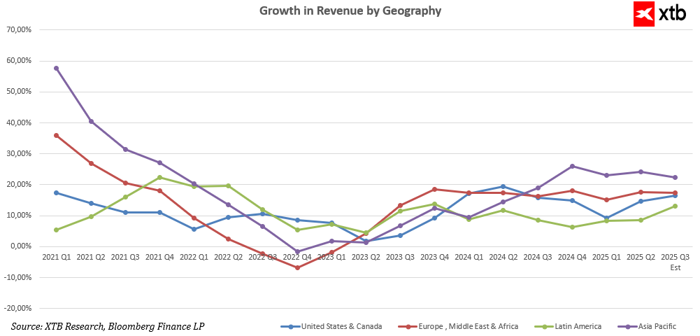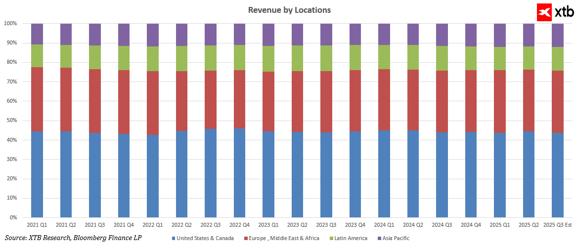 - Najväčší trh, ktorý predstavuje viac ako tretinu celkových príjmov. Tento región zaznamenáva stabilný, mierny medzištvrťročný rast, obvykle v rozmedzí niekoľkých až dvojciferných percent.