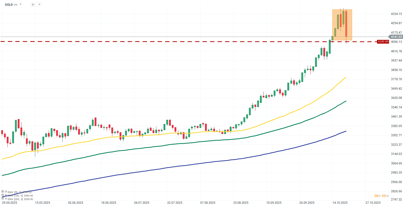 V posledních týdnech došlo k silnému růstu cen zlata, které nedávno dosáhly rekordní úrovně okolo 4 381 USD za unci. Aktuálně probíhá prudká korekce, přičemž cena klesá o více než 5 %, což představuje největší jednodenní pokles od srpna 2020. Klíčové úrovně podpory se nacházejí kolem 4 100 USD, dále 4 050 USD a psychologické hranice 4 000 USD. Proražení těchto úrovní by mohlo signalizovat další pokles.