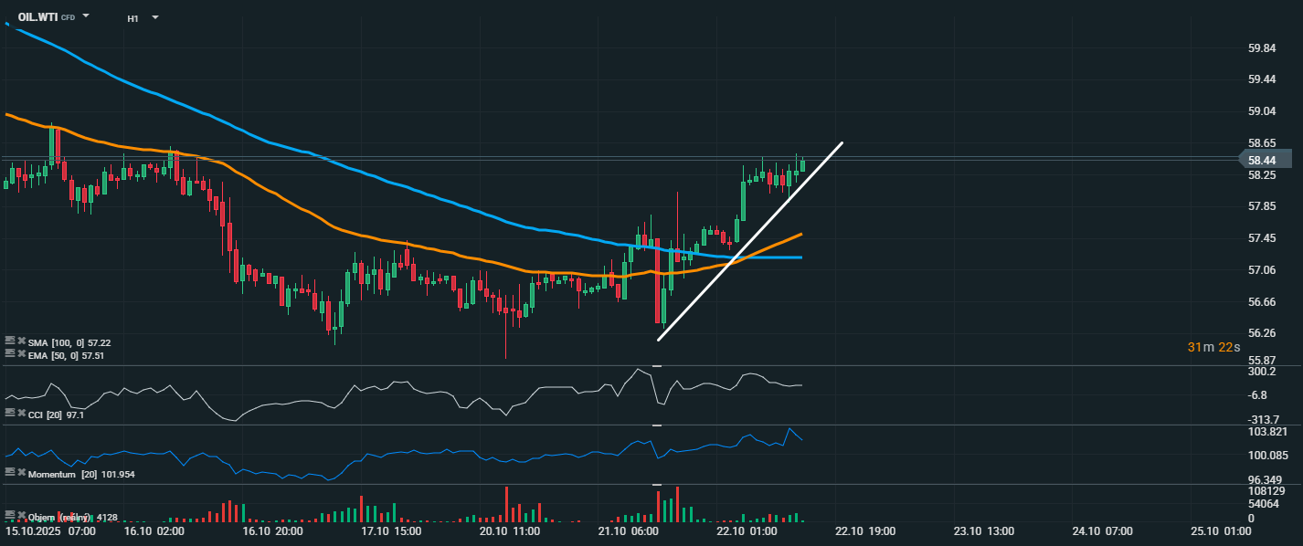 Cena americké ropy WTI nadále posiluje a aktuálně se obchoduje kolem úrovně 58,44 USD, což představuje růst o přibližně 2 %. Na grafu je patrný jasný rostoucí trend, který je podpořen průrazem nad oba hlavní klouzavé průměry – EMA 50 (57,51 USD) i SMA 100 (57,22 USD). Růstový trend je navíc doprovázen výrazným momentem (101,95) a CCI (97,1), které se pohybují v pásmu překoupenosti. To naznačuje silnou nákupní aktivitu, ale zároveň i možnost krátkodobé konsolidace nebo technické korekce, pokud se nákupní tlak dočasně vyčerpá. Objem obchodů během průrazu výrazně vzrostl, což dodává důvěru v sílu aktuálního pohybu. Trh může cílit na rezistenci v pásmu kolem 59,00–59,40 USD, kde se nacházejí předchozí lokální maxima.