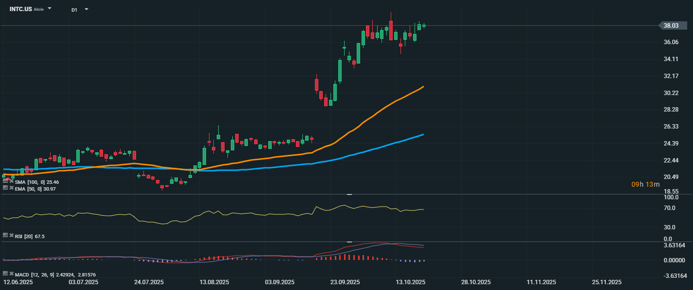 Akcie společnosti Intel pokračují v silném růstovém trendu a aktuálně se obchodují na úrovni 38,03 USD, což představuje výrazné zotavení z předchozích úrovní pod 30 USD. Cena se s přehledem drží nad oběma klouzavými průměry – EMA 50 (30,97 USD) a SMA 100 (25,46 USD) – což potvrzuje býčí tržní strukturu. RSI dosahuje hodnoty 67,5, tedy těsně pod překoupenou zónou, což svědčí o stále silném nákupním momentu, ale zároveň varuje před možným krátkodobým přehřátím trhu. MACD zůstává v pozitivní oblasti, i když histogram začíná naznačovat mírné zpomalení růstového tempa.