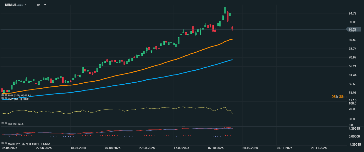 Akcie společnosti Newmont zažily v posledních týdnech výrazný růst a po dosažení maxima nad 94 USD aktuálně korigují zpět k úrovni 86,29 USD. I přes pokles se cena stále drží bezpečně nad klouzavými průměry – EMA 50 (80,88 USD) a SMA 100 (69,81 USD) – což nadále potvrzuje býčí střednědobý trend. RSI je na hodnotě 53,5, tedy v neutrálním pásmu a bez známek překoupenosti. To dává trhu prostor pro stabilizaci nebo další růst, pokud se cena udrží nad EMA 50. MACD zůstává pozitivní, i když histogram naznačuje mírné slábnutí tempa.