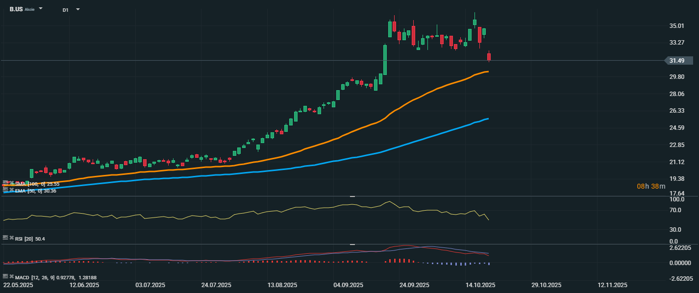 Akcie společnosti Barrick Gold po dosažení vrcholu nad 35 USD rovněž vstoupily do fáze korekce a nyní se obchodují na úrovni 31,49 USD, tedy těsně nad EMA 50 (30,36 USD). SMA 100 (28,35 USD) zůstává bezpečně níže, což ukazuje na přetrvávající střednědobý růstový trend. RSI klesl na 50,4, což značí ochlazení nákupního momenta. MACD sice zůstává nad nulou, ale podobně jako u Newmontu ukazuje histogram na oslabování dynamiky růstu. Klíčovou technickou úrovní pro udržení pozitivního vývoje je hranice 30–30,50 USD. Její udržení by mohlo být signálem pro pokračování trendu po konsolidaci.