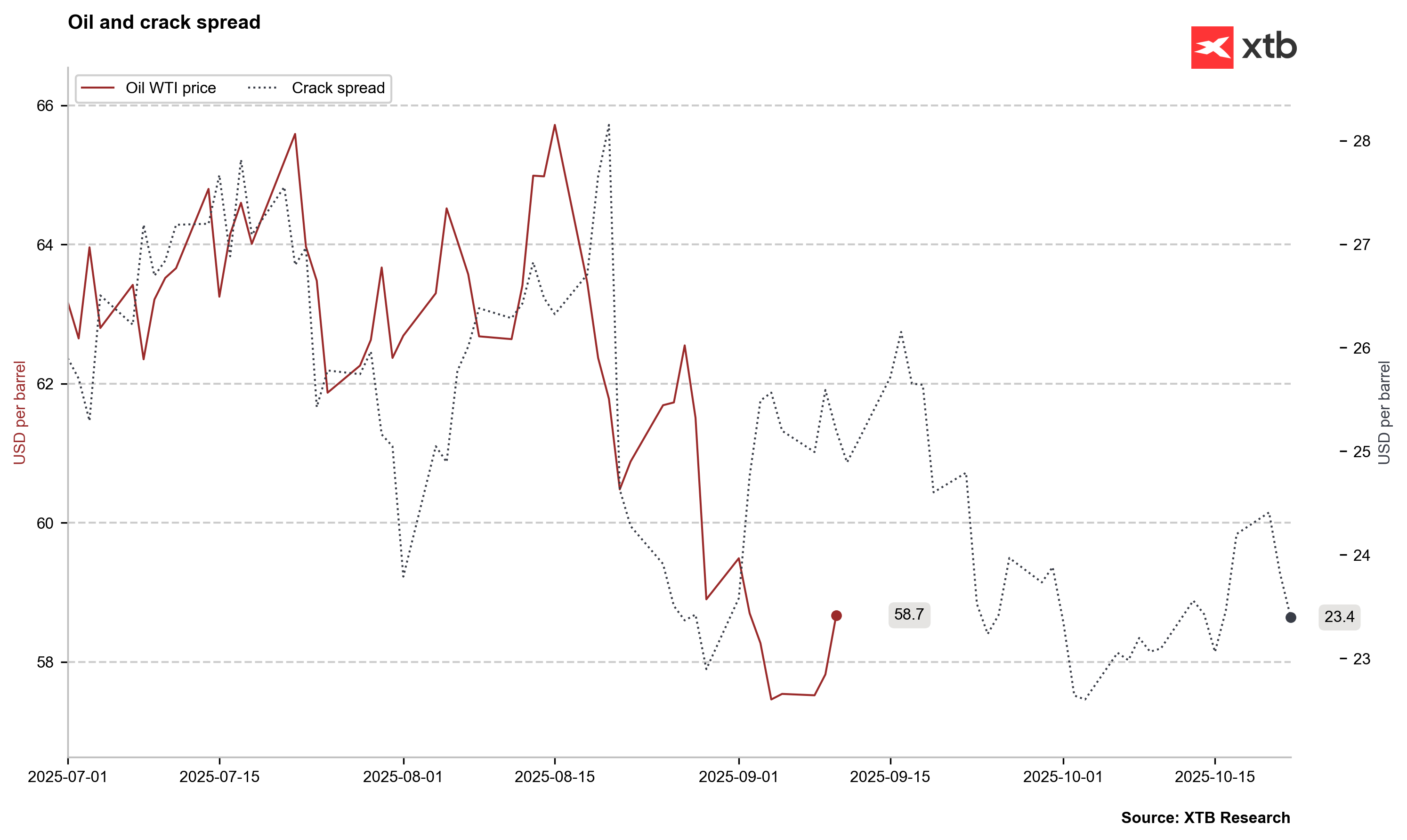 Hlavní indikátor trhu s ropou – tzv. crack spread (rozdíl mezi cenami ropy a ropných produktů) – zůstává relativně nízký ve srovnání s předchozími měsíci, ale stále je velmi vysoký z historického hlediska. Nicméně spread s 30denní splatností naznačuje, že v nejbližším období nelze očekávat výrazný nárůst poptávky po ropě v USA.