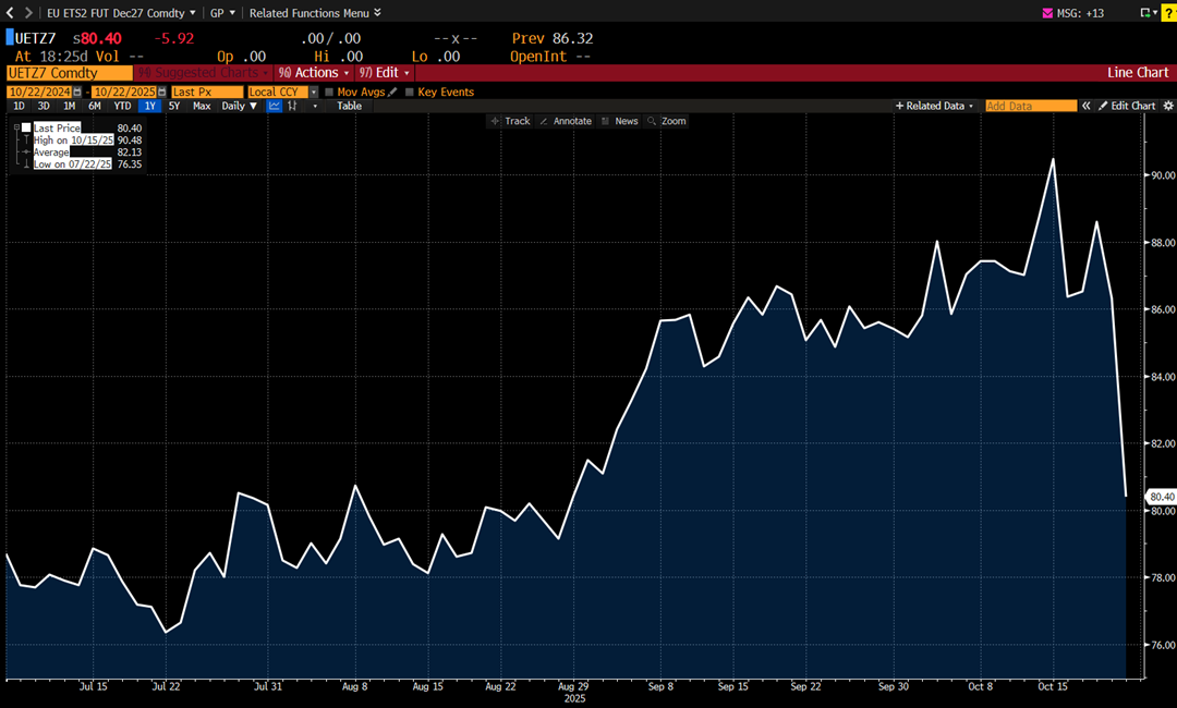 Daný termínový kontrakt na povolenku EU ETS2 se po dnešním výrazném poklesu ocitl na úrovni, kde byl naposledy koncem letošního srpna.