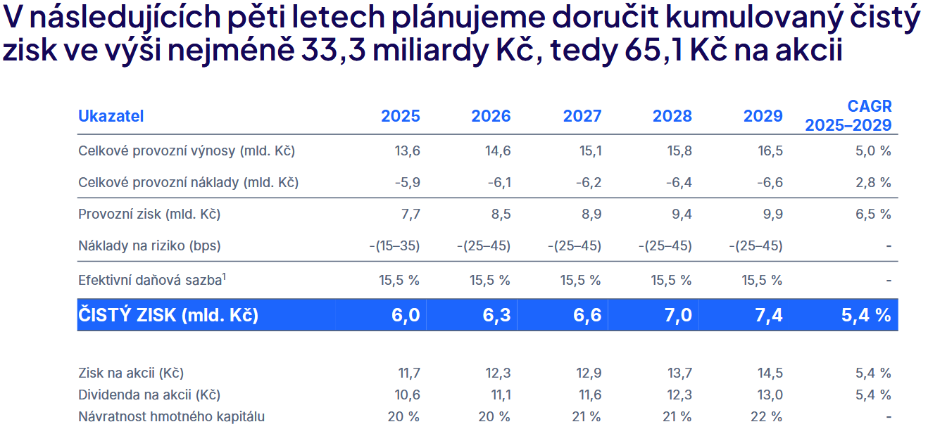 Management spolu s výsledky opětovně potvrdil střednedobý výhled, který zveřejnil již s výsledky za 4Q 2024.V období 2025-2029 cílí na dosažení kumulovaného čistého zisku ve výši nejméně 33,3 mld. Kč.