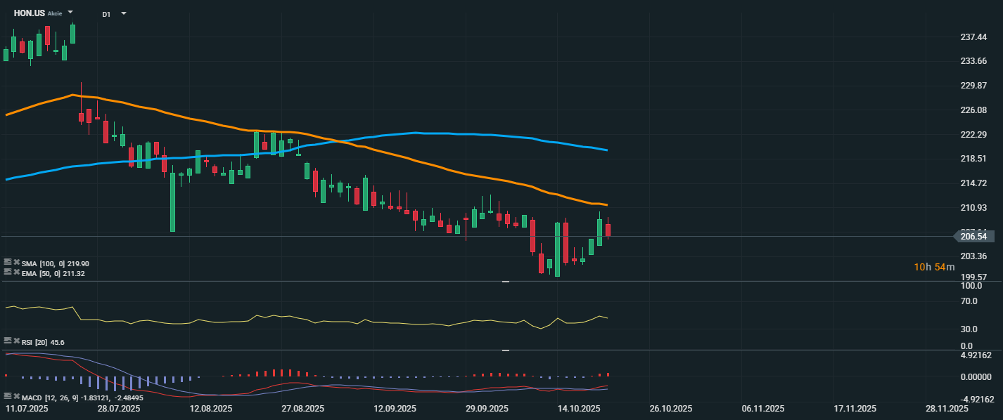 Akcie společnosti Honeywell se aktuálně obchodují na ceně 206,54 USD a pokoušejí se stabilizovat po předchozím poklesu. Cena se stále nachází pod oběma klouzavými průměry, což technicky značí přetrvávající medvědí trend. EMA 50 se pohybuje na úrovni 211,32 USD a SMA 100 výše na 219,90 USD. RSI dosahuje hodnoty 45,6, což značí neutrální až slabé momentum bez známek přeprodanosti nebo překoupenosti.