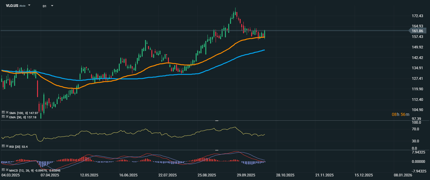 Akcie společnosti Valero Energy se aktuálně obchodují na ceně 161,86 USD a technicky se nacházejí v konsolidační fázi po výrazném růstu, který vrcholil koncem září. Cena se nyní drží nad klouzavými průměry – konkrétně nad EMA 50 (157,18 USD) a SMA 100 (147,97 USD), což potvrzuje stále platný býčí trend, i když s mírným zpomalením tempa.