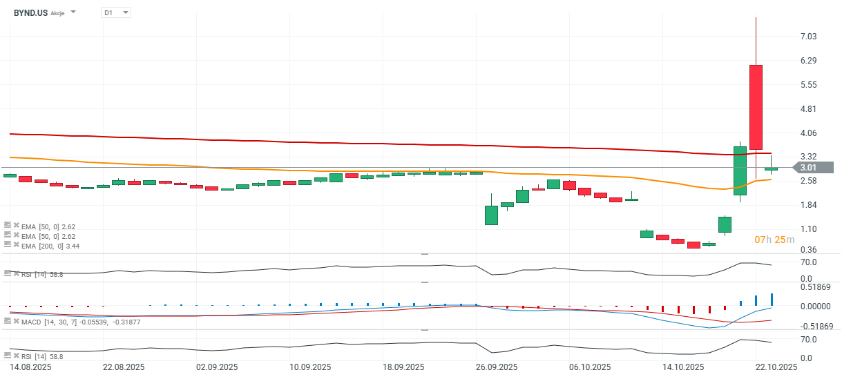 Podle údajů společnosti Ortex činí aktuální zájem o shrotování akcií společnosti Beyond Meat (BYND.US) 109 % volně obchodovatelných akcií, což představuje nárůst oproti včerejším 82 %. To znamená, že medvědí investoři si vypůjčili a prodali více akcií, než je ve volném oběhu skutečně k dispozici. Jedná se o velmi vzácnou a extrémní situaci, která může naznačovat značný pesimismus ohledně podnikání společnosti, ale také představuje potenciální riziko krátkodobého tlaku, pokud cena začne stoupat a prodejci krátkých pozic budou nuceni odkoupit akcie, aby uzavřeli své pozice. Za takových okolností by mohlo dojít k dalšímu oživení, pokud se výrazně zvýší objem nákupů akcií BYND.US. Na druhou stranu je finanční situace společnosti obtížná a bez výrazného zlepšení fundamentů je těžké očekávat, že optimismus retailových investorů sám o sobě bude schopen trvale zvrátit trend.