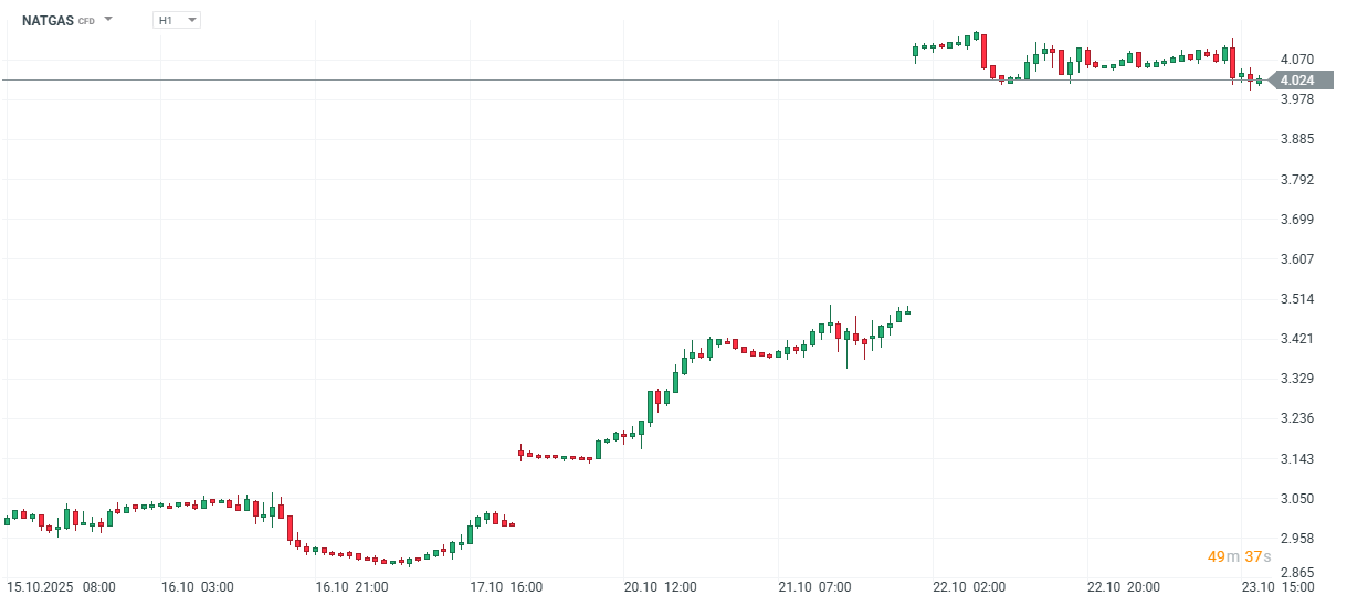 NATGAS dnes po rolloveru ztrácí poté, co zpráva o zásobách v USA vykázala hodnotu 87 mld. oproti očekávaným 83 mld. a předchozím 80 mld., což signalizuje rostoucí produkci a ochlazující se poptávku navzdory začátku topné sezóny.