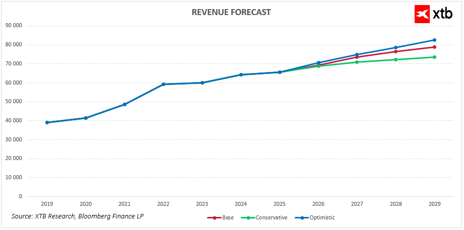 - Konzervativní scénář zohledňuje vyšší rizika, jako je vypršení platnosti klíčových patentů, rostoucí konkurence generických léků a potenciální regulační výzvy. V tomto scénáři se růst tržeb zpomaluje a na konci prognózy dosahuje přibližně 74 miliard dolarů. Společnost si však díky diverzifikaci portfolia a efektivnímu řízení nákladů udržuje odolnost a finanční stabilitu.