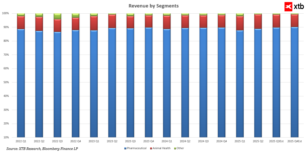 Segment zdraví zvířat, ačkoli menší, zůstává stabilním a mírně rostoucím odvětvím s čtvrtletními tržbami mezi 1,2 a 1,6 miliardami dolarů, což dokazuje účinnou diverzifikaci zdrojů příjmů. Segment „Ostatní“ je nejmenší a nejvolatilnější, ale slouží jako doplňkové odvětví, které se flexibilně přizpůsobuje potřebám trhu.