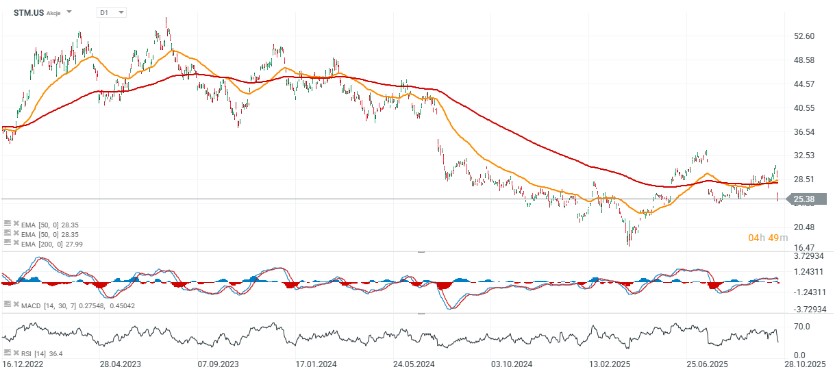 Akcie společnosti klesly téměř o 14 % poté, co STMicroelectronics představila slabší výhled tržeb na 4. čtvrtletí 2025, než se očekávalo. Navzdory solidnímu oživení ve třetím čtvrtletí výhled signalizuje přetrvávající problémy napříč klíčovými trhy – zejména v automobilovém a průmyslovém segmentu.