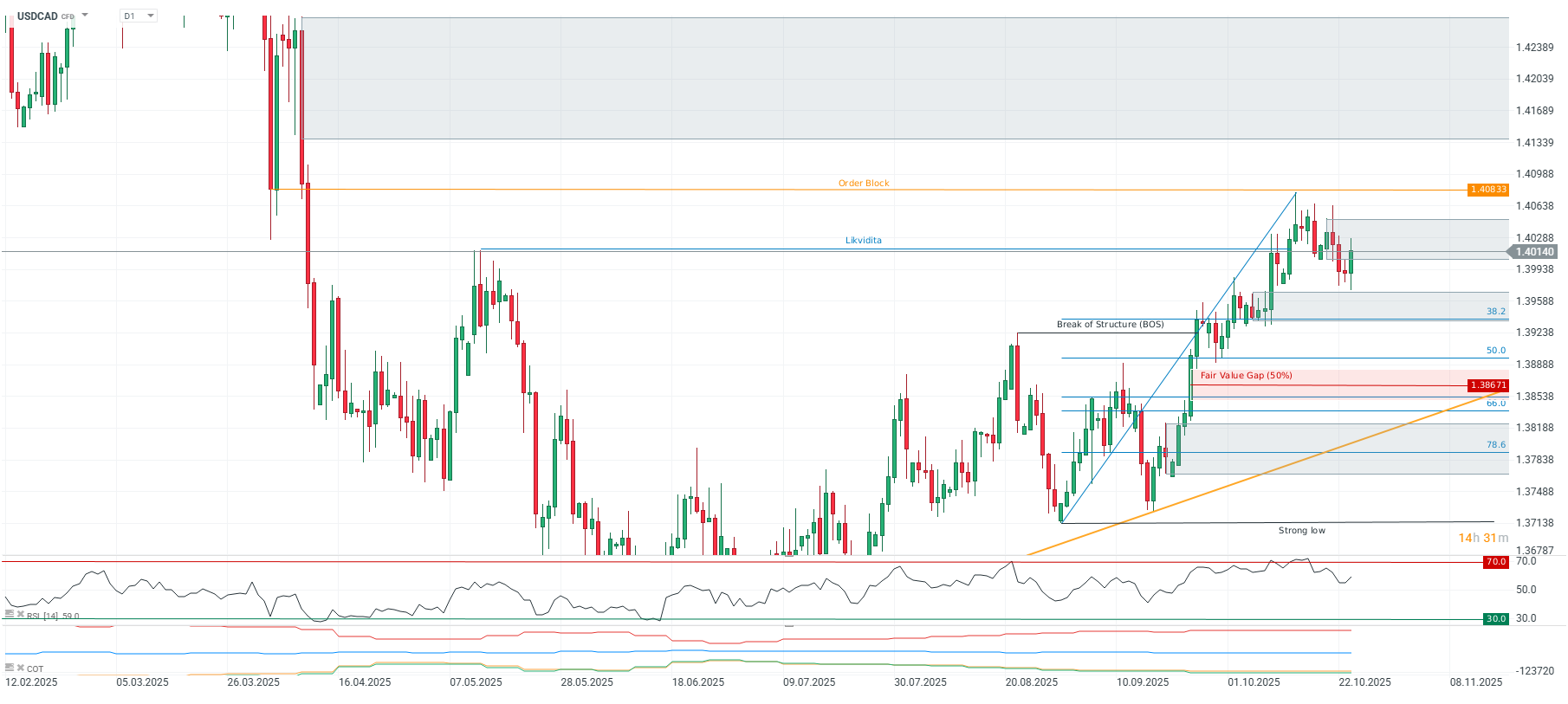 Měnový pár USD/CAD se po výrazném růstu z přelomu září a října pohybuje v korekční fázi, kdy trh testuje důležitou rezistenční oblast. Na denním grafu (D1) je patrné, že po Break of Structure (BOS) došlo k potvrzení býčího trendu, který se aktuálně zastavil v zóně 1,40100–1,40500, kde se nachází významná a silná supply zóna. Tato oblast byla místem silné nabídky, odkud začal poslední výprodej. Její reakce nyní může naznačovat, že trh zde ztrácí momentum a chystá se na pokračující pullback.