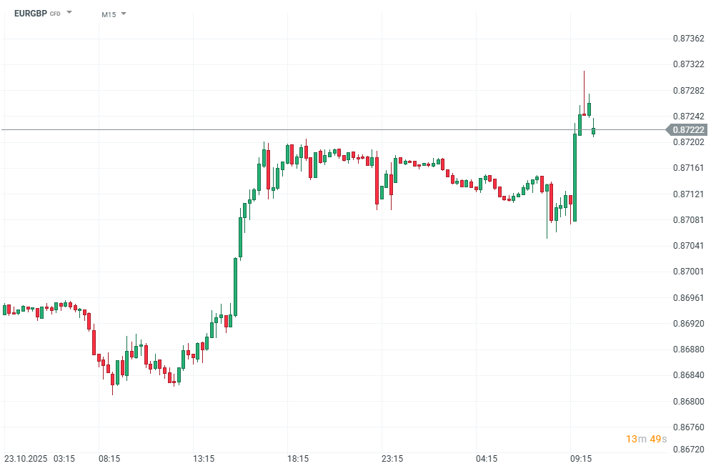 Pár EUR/GBP se pohybuje výše poté, co jsme se dozvěděli údaje o CPI z Německa za říjen a údaje z britského trhu práce za říjen. Mnohem vyšší než očekávaný nárůst míry nezaměstnanosti ve Spojeném království vyvolává naděje na rychlejší snižování sazeb, což oslabuje libru vůči euru. -