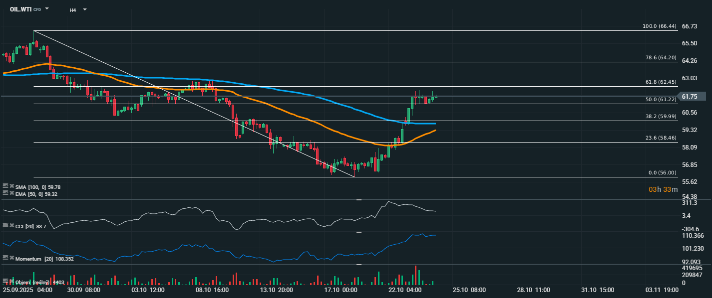 Z pohledu Fibonacciho hladin představuje další důležitou rezistenci úroveň 63,03 USD (61,8 %) a následně 64,26 USD (78,6 %). Udržení ceny nad 61,22 USD je klíčové pro zachování aktuálního býčího scénáře. Naopak nejbližší podpora se nachází v pásmu 59,30–59,78 USD, tedy u zón prolomených klouzavých průměrů.