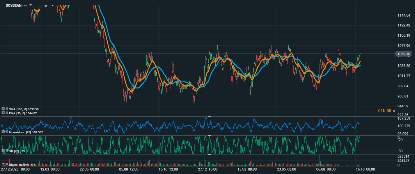 U sóji se cena pohybuje na úrovni 1059,70 USD, přičemž po silném propadu v první polovině roku došlo ke stabilizaci a opakovaným pokusům o průraz směrem vzhůru. V posledních dnech cena opět roste nad EMA 50 (1044,07 USD) i SMA 100 (1035,58 USD), což podporuje pozitivní trendový obrat. Momentum je na hodnotě 101,6, což signalizuje rostoucí zájem kupců. RSI je na hodnotě přibližně 60, tedy v býčí zóně, avšak ještě mimo překoupené úrovně. Objem obchodů potvrzuje zvýšenou aktivitu, což podporuje možnost pokračování růstu.