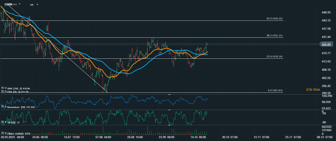 Cena kukuřice aktuálně testuje úroveň 426,09 USD, která odpovídá zóně krátkodobé rezistence. Předtím prorazila klíčovou sestupnou trendovou linii, čímž potvrdila obrat trendu z klesajícího na růstový. Z pohledu Fibonacciho retracementu se cena nachází nad hladinou 23,6 % (416,14 USD), a pokud býci udrží momentum, dalším cílem může být 38,2 % (431,11 USD). Cena se pohybuje nad EMA 50 (421,00 USD) i SMA 100 (418,96 USD), což potvrzuje pozitivní technické nastavení. Momentum (101,5) ukazuje na rostoucí dynamiku, zatímco RSI zůstává neutrální (kolem -21), bez známek překoupenosti.