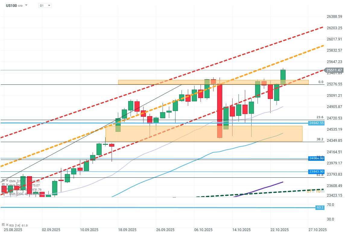Na grafu je vidět úspěšné proražení předchozího vrcholu po několika neúspěšných pokusech během minulého týdne. Cena zároveň ubránila spodní hranici rostoucího trendu a klouzavé průměry EMA potvrzují pokračující růstový směr. V případě dočasné ztráty aktivity kupujících se nejbližší podpora nachází na úrovni 25 270 bodů (poslední vrchol). Níže se podpora nachází kolem 24 720 bodů, kde probíhá klouzavý průměr EMA25 a zároveň úroveň Fibonacciho retracementu 23,6 %.