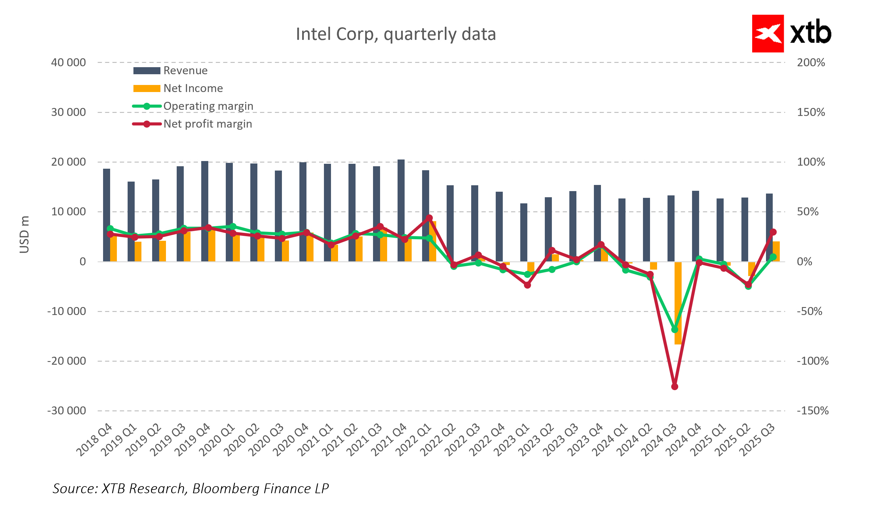 Intel byl kdysi dominantní společností ve svém oboru, avšak postupně technologicky usnul az firmy, která kdysi vydělávala desítky miliard se stala firma, která přináší kvartál co kvartál horší a horší čísla a je dlouhodobě ve ztrátě. V této tradici Intel pokračoval i nyní, jelikož v rámci výsledků nepřinesl snad ani jednu pozitivní informaci, za což jej trh trestá výrazným poklesem akcií. -