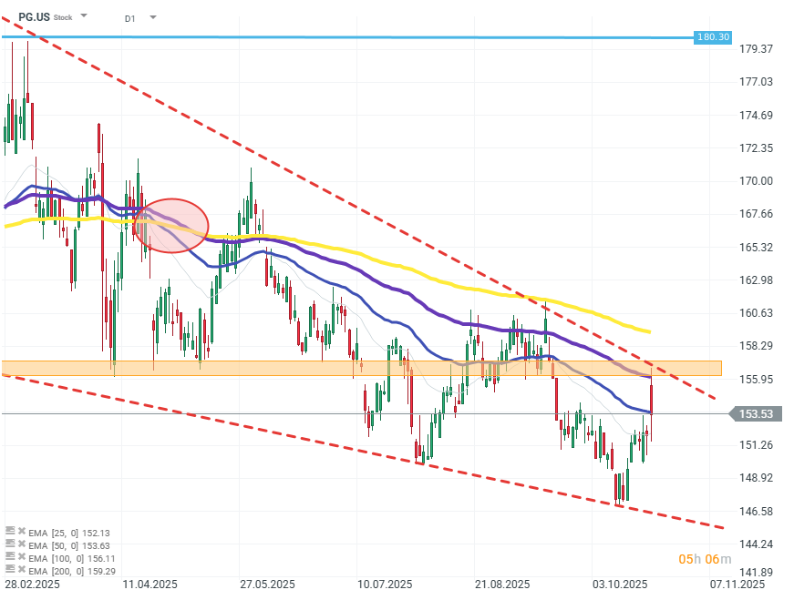 Procter & Gamble je americký gigant v segmentu rychloobrátkového spotřebního zboží s portfoliem globálních značek. Patří mezi největší společnosti ve spotřebitelském sektoru a je řazena mezi tzv. Dividendové krále. Nejnovější výsledky, které firma zveřejnila před dnešní seancí, potvrzují pomalý, ale stabilní růst tržeb i zisků. Akcie společnosti dnes rostou přibližně o 2 %.