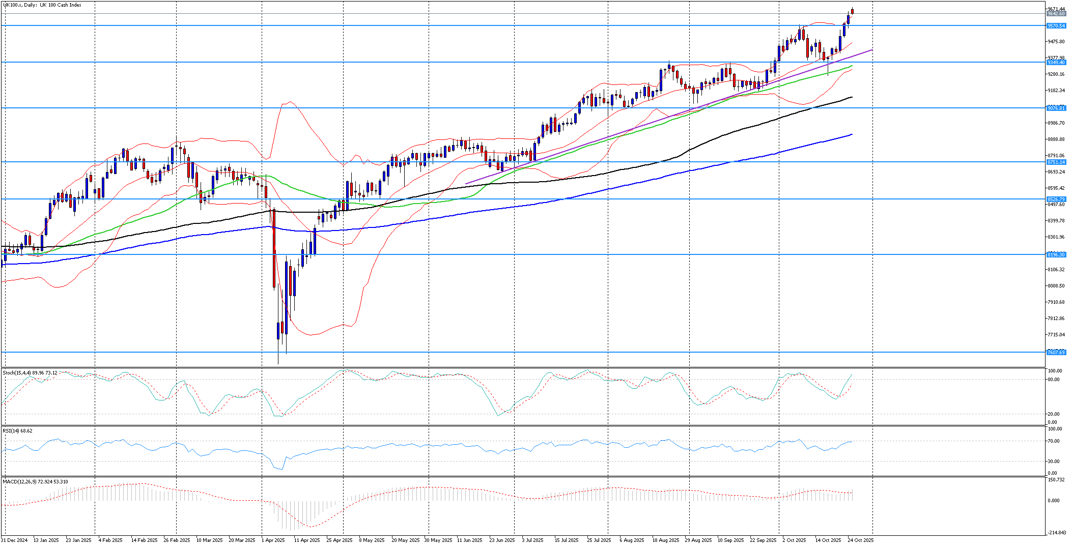 Akciový index UK100 pokračuje v působivém růstu a ve středu dosáhl nového historického maxima na úrovni 9 680 bodů. V posledních pěti seancích zaznamenal čtyři růstové dny, čímž potvrdil trvalou sílu svého býčího trendu. Aktuálně se obchoduje těsně pod rekordní hranicí, přičemž celkový technický obraz zůstává pozitivní. Dlouhodobý vzestupný trend, který započal v květnu, zůstává pevně zachován a je dále posílen strmějším růstovým kanálem, který se formuje od září. Rally podporují i makroekonomické faktory. Slabší než očekávaná inflační data z Velké Británie (CPI za září) zvýšila pravděpodobnost, že Bank of England přistoupí k dalšímu uvolnění měnové politiky, což posiluje apetit investorů po akciích. K růstu sentimentu přispívá i mezinárodní vývoj – zejména nové sankce USA proti ruským ropným společnostem, které zvýšily atraktivitu britských energetických titulů. Z technického pohledu však nelze vyloučit krátkodobou korekci. Stochastický oscilátor zůstává v překoupené oblasti, zatímco RSI se pohybuje těsně pod touto zónou. MACD se udržuje nad signální linií v kladném teritoriu, což potvrzuje přetrvávající, avšak mírně zpomalující býčí momentum. Pokud býci udrží iniciativu, nejbližší odpor se nachází na úrovni 9 750 bodů. Průlom nad tuto bariéru by mohl otevřít cestu k psychologickému milníku 10 000 bodů, který by znamenal nový vrchol dlouhodobého trendu. Naopak případná korekce by mohla poslat index směrem k 9 300, kde se nachází 50denní klouzavý průměr a dolní okraj Bollingerova pásma. Další významná podpora leží poblíž 9 000 bodů, kde se 100denní SMA protíná s hlavní rostoucí trendovou linií z května. Souhrnně řečeno, UK100 zůstává v býčím nastavení, i když rostoucí překoupenost trhu a technické signály varují před možným krátkodobým oslabením. Investoři by tak měli zůstat obezřetní, jelikož kombinace vysoké valuace a geopolitických rizik může přinést zvýšenou volatilitu.