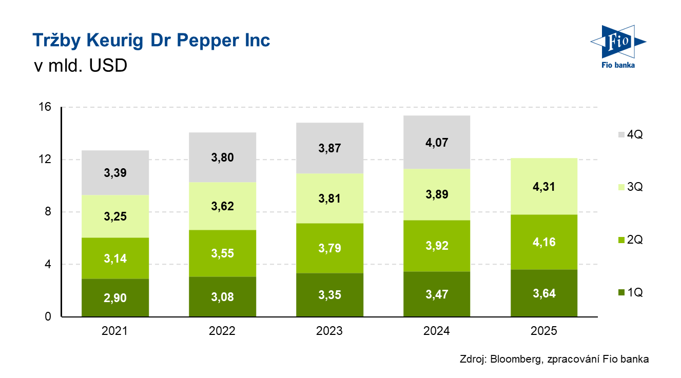 Americký výrobce nealkoholických nápojů Keurig Dr Pepper zveřejnil výsledky hospodaření za třetí kvartál roku 2025. Tržby překonaly očekávání a společnost zároveň navýšila svůj celoroční výhled růstu tržeb. Společnost si zajistila finanční balíček v hodnotě 7 mld. USD od společností Apollo a KKR pro financování akvizice nizozemské JDE Peet’s, kterou společnost oznámila na konci srpna.