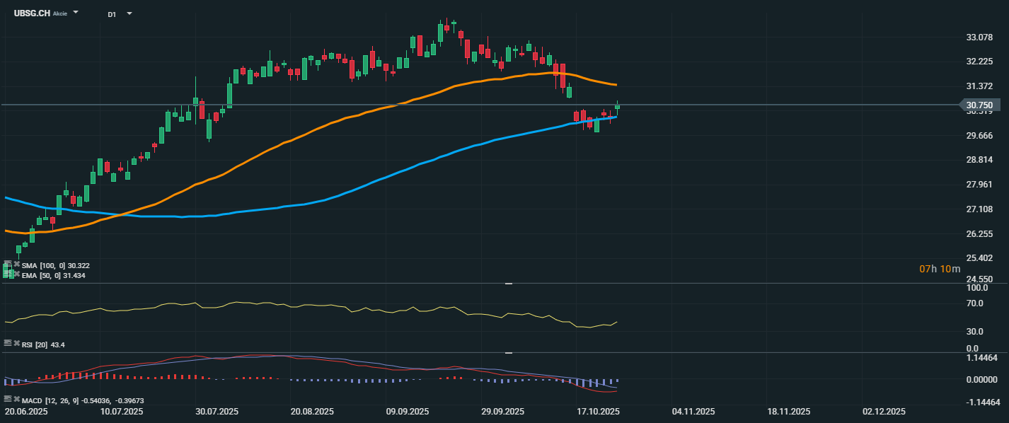 Akcie švýcarské banky UBS se začínají stabilizovat v oblasti 30,77 CHF, kde dochází ke kontaktu s klíčovým klouzavým průměrem SMA 100 (30,32 CHF). Tato úroveň momentálně slouží jako technická podpora, zatímco EMA 50 (31,43 CHF) působí jako nejbližší rezistence.