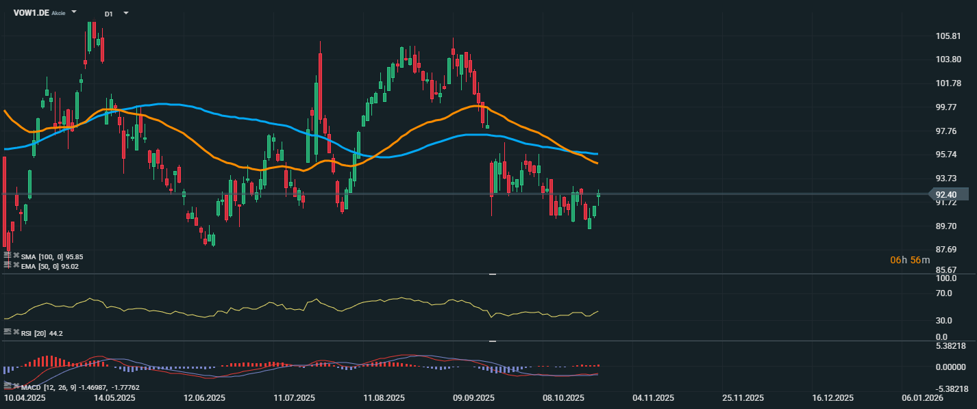 Akcie společnosti Volkswagen se aktuálně obchodují na úrovni 92,40 EUR, tedy pod oběma klouzavými průměry – EMA 50 (95,02 EUR) i SMA 100 (95,85 EUR). RSI osciluje na hodnotě 44,2, což značí mírně negativní momentum bez známek přeprodanosti. MACD se nachází hluboko pod nulovou linií, i když histogram začíná mírně růst směrem k signální linii, což může naznačovat slabý pokus o konsolidaci nebo krátkodobý odraz.