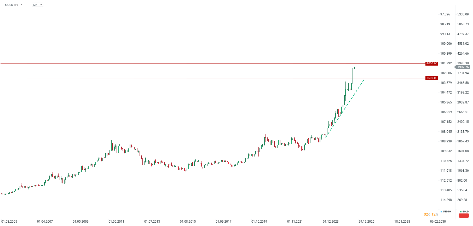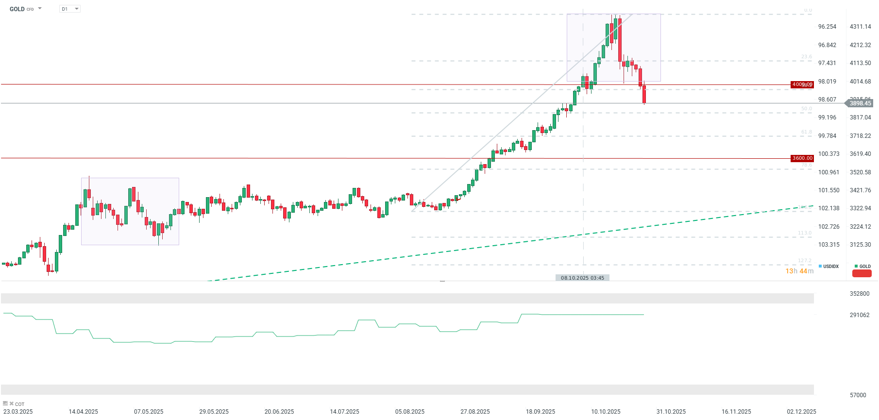 Cena zlata dnes dočasně klesla pod 3 900 USD za unci, čímž prolomila 38,2% retracement a přiblížila se k podpoře na úrovni 50,0% retracementu poslední vzestupné vlny. Rozsah korekce přesahuje to, co bylo pozorováno v dubnu a květnu. Zdroj: xStation5