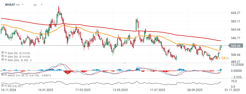 - Nejnovější údaje USDA (před zastavením podávání zpráv) ukázaly, že vývoz pšenice za týden končící 23. říjnem činil 258 543 metrických tun, což je o 47,6 % méně než v předchozím týdnu a o 12 % méně než v loňském roce. Mezi hlavní destinace patřily Jižní Korea (109 639 tun), Vietnam (46 079 tun) a Japonsko (33 899 tun). Navzdory poklesu v tomto týdnu celkový vývoz za rok 2025/26 činí 11,46 milionů tun, což představuje meziroční nárůst o 19,4 %, což signalizuje, že dlouhodobý vývozní výhled zůstává příznivý pro ceny pšenice v USA.