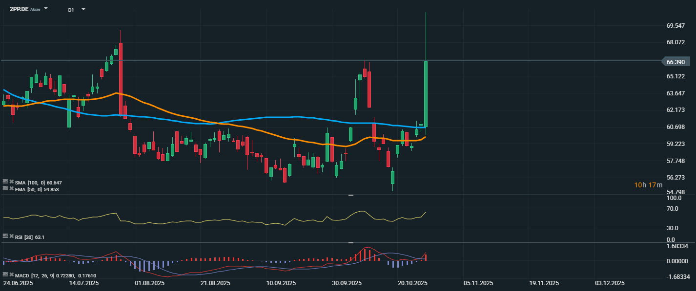 Z hlediska struktury trhu akcie PayPalu prorazily nad předchozí cenové vrcholy z července a září, čímž otevřely prostor pro další růstový impuls. Psychologická hranice 70 EUR se nyní jeví jako nejbližší možná rezistence. Naopak oblast kolem 61–62 EUR, kde se nachází proražené klouzavé průměry, bude nyní sloužit jako klíčová podpora, pokud by došlo k částečnému výběru zisků.