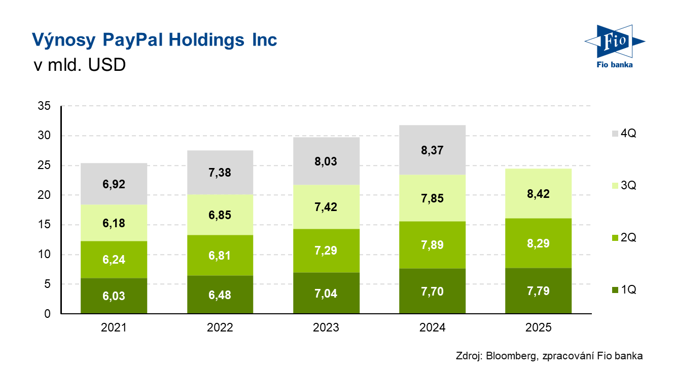 Zprostředkovatel plateb PayPal zveřejnil výsledky za 1. čtvrtletí roku 2025. Společnost vykázala meziroční růst výnosů o 1,2 % na 7,79 mld. USD, což bylo mírně pod průměrným očekáváním analytiků, kteří předpokládali výnosy 7,85 mld. USD. Vzhledem ke globální makroekonomické nejistotě PayPal ponechal svůj celoroční výhled nezměněný. Společnost rovněž zpětně odkoupila 19 mil. akcií za 1,5 mld. USD. -