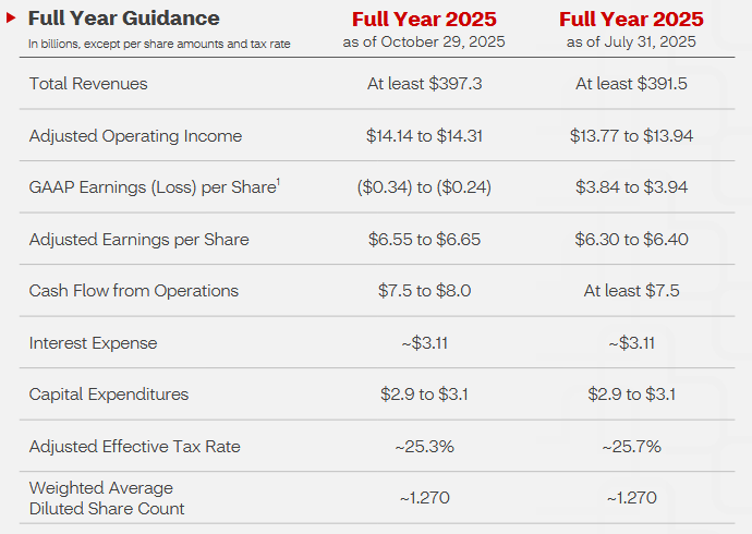 Co se týče celoročního výhledu, očištěný zisk na akcii společnost navýšila z pásma 6,30 až 6,40 USD na 6,55 až 6,65 USD. Trh očekával 6,38 USD. Společnost zároveň zvyšuje svůj výhled provozních hotovostních toků na 7,5 až 8 mld. USD, zatímco dříve počítala s částkou minimálně 7,5 mld. USD při očekávání Wall street 8,46 mld. USD.