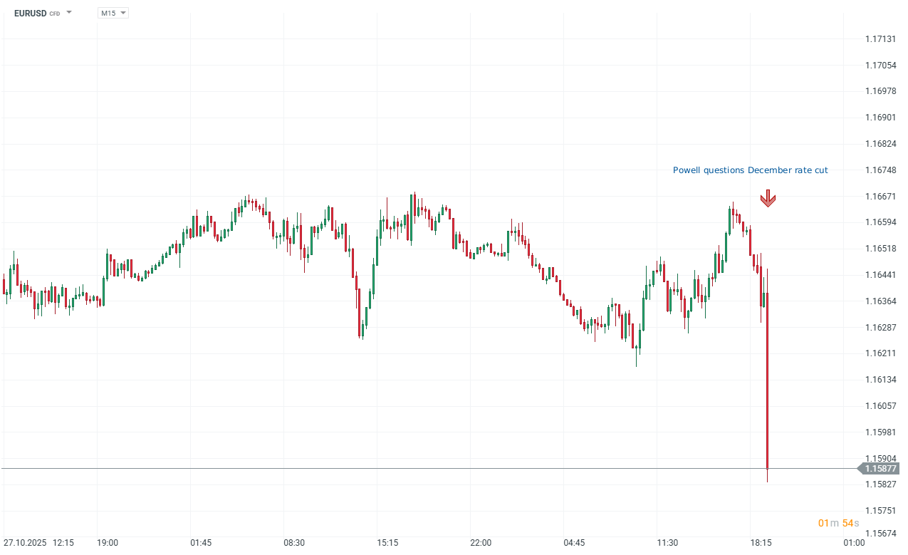 Během tiskové konference předseda Powell uvedl, že diskuze mezi členy FOMC byla intenzivní a obsahovala výrazné rozdíly v názorech. Zdůraznil, že rozhodnutí o prosincovém snížení sazeb není předem dané. Ačkoli samotné prohlášení Fedu lze interpretovat jako holubičí – zejména s ohledem na ukončení QT – nejistota kolem prosincového zasedání vedla k posílení dolaru. Pravděpodobnost prosincového snížení sazeb nyní podle trhu klesla přibližně na 70 %, z předchozích 90 %.