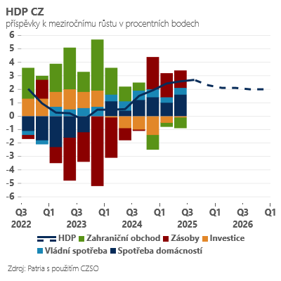 Pokud se první odhad HDP potvrdí a nedojde k výraznější negativní revizi, přepíšeme odhad růstu pro tento i příští rok lehce vzhůru. I když budeme dál předpokládat lehké zvolnění dynamiky růstu na přelomu roku, celkový růst za rok 2025 pravděpodobně skončí v blízkosti 2,5 % (náš dnešní odhad 2,1 %) a v roce 2026 se pak můžeme i s negativními efekty obchodních válek pohybovat v blízkosti 2 % (dnes 1,9 %).