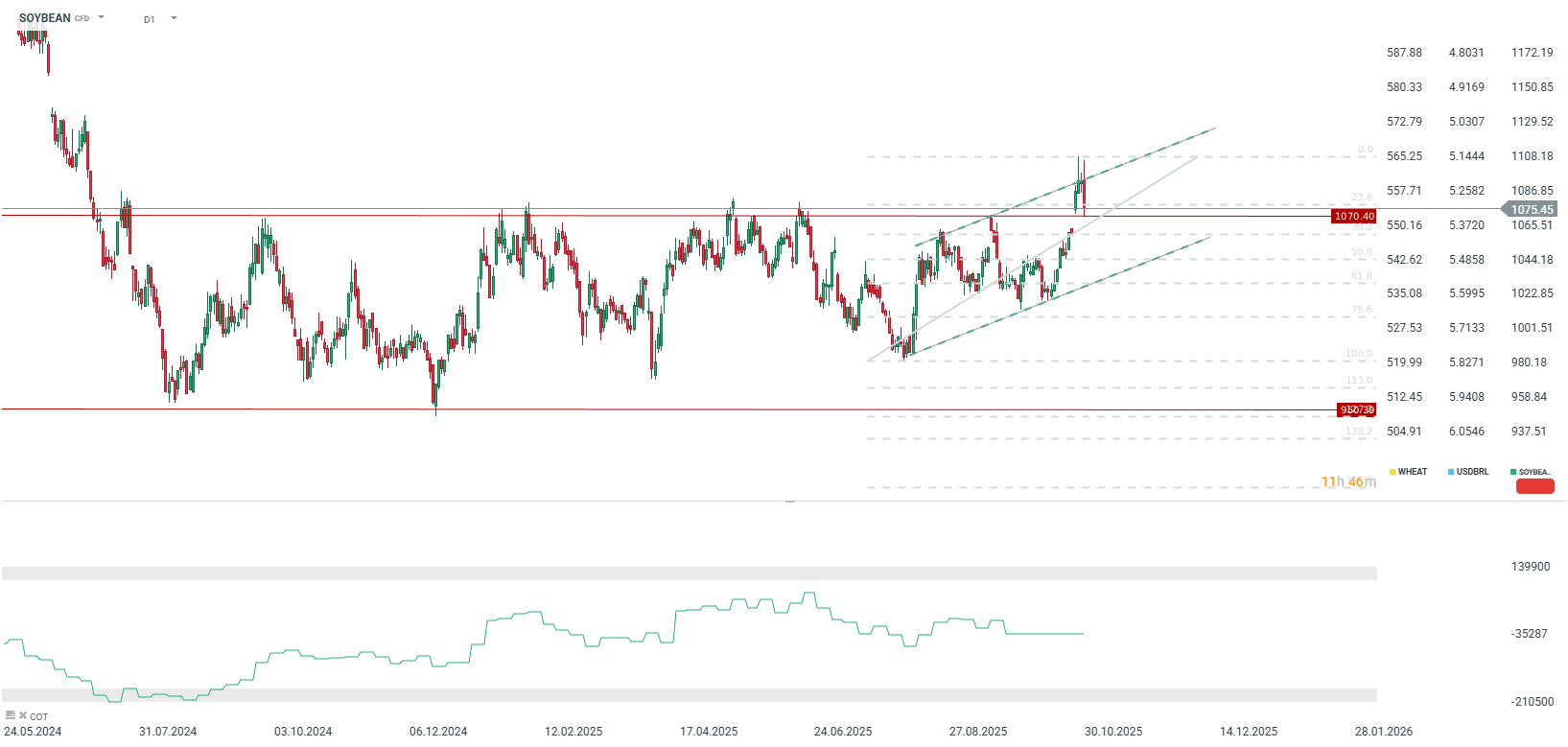 Cena se aktuálně odráží od úrovně 1 070 centů za bušel, ale nelze vyloučit scénář uzavření gapu, který vznikl na začátku týdne. Klíčová podpora je na úrovni 1 058, což odpovídá 38,2 % Fibonacciho retracementu poslední růstové vlny, a 1 042 jako 50,0 % retracement.
