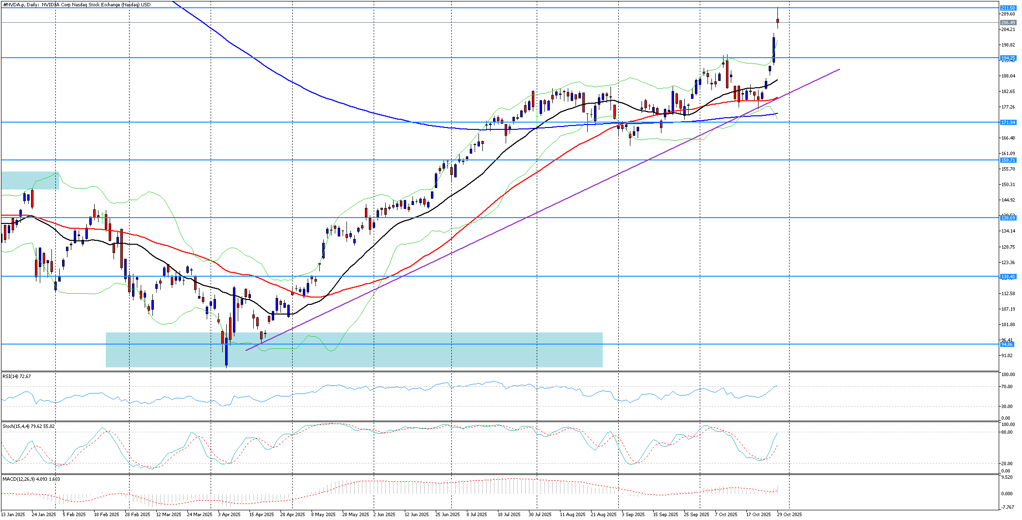 Akcie společnosti Nvidia zaznamenaly za posledních 24 hodin mimořádný růst o více než 10 %, čímž rozšířily úterní prudké zisky a posunuly cenu akcií nad hranici 210 USD. Díky tomu se Nvidia stala první společností v historii, která dosáhla tržní kapitalizace 5 bilionů dolarů. Tento výjimečný růst odráží pokračující dominanci firmy v oblasti umělé inteligence, kterou dále podpořila oznámení generálního ředitele Jensena Huanga o objednávkách čipů AI v hodnotě 500 miliard dolarů a plánech na výstavbu sedmi superpočítačů pro americkou vládu. Technické indikátory jednoznačně potvrzují silné býčí momentum. MACD posiluje v kladném teritoriu, RSI se přibližuje úrovni 70 a stochastický oscilátor se pohybuje v překoupené oblasti, což naznačuje, že trh má stále prostor k dalšímu růstu – byť s rizikem krátkodobého vyčerpání. Cena akcií totiž již druhou seanci po sobě prorazila horní Bollingerovo pásmo, což bývá varovným signálem pro možné krátkodobé vybírání zisků. Pokud by došlo ke korekci, první úroveň podpory se nachází na úterním rekordu 204,25 USD, zatímco další významná zóna leží mezi 190–195 USD, kde se soustřeďují předchozí měsíční maxima. Hlubší pokles by mohl zamířit k úzkému pásmu 20denního a 50denního jednoduchého klouzavého průměru (SMA) v oblasti 186–186,50 USD, které již v uplynulých týdnech opakovaně zastavovalo pokles ceny. Naopak, pokud bude býčí trend pokračovat, nejbližší odpor lze očekávat na 217,46 USD, zatímco další cíle se nacházejí na psychologických úrovních 230 USD a následně v oblasti 240–250 USD. Celkově zůstává technický výhled pro akcie Nvidie jednoznačně pozitivní. Společnost nadále těží z bezprecedentní poptávky po čipech pro umělou inteligenci, která posiluje její dominantní postavení v odvětví.