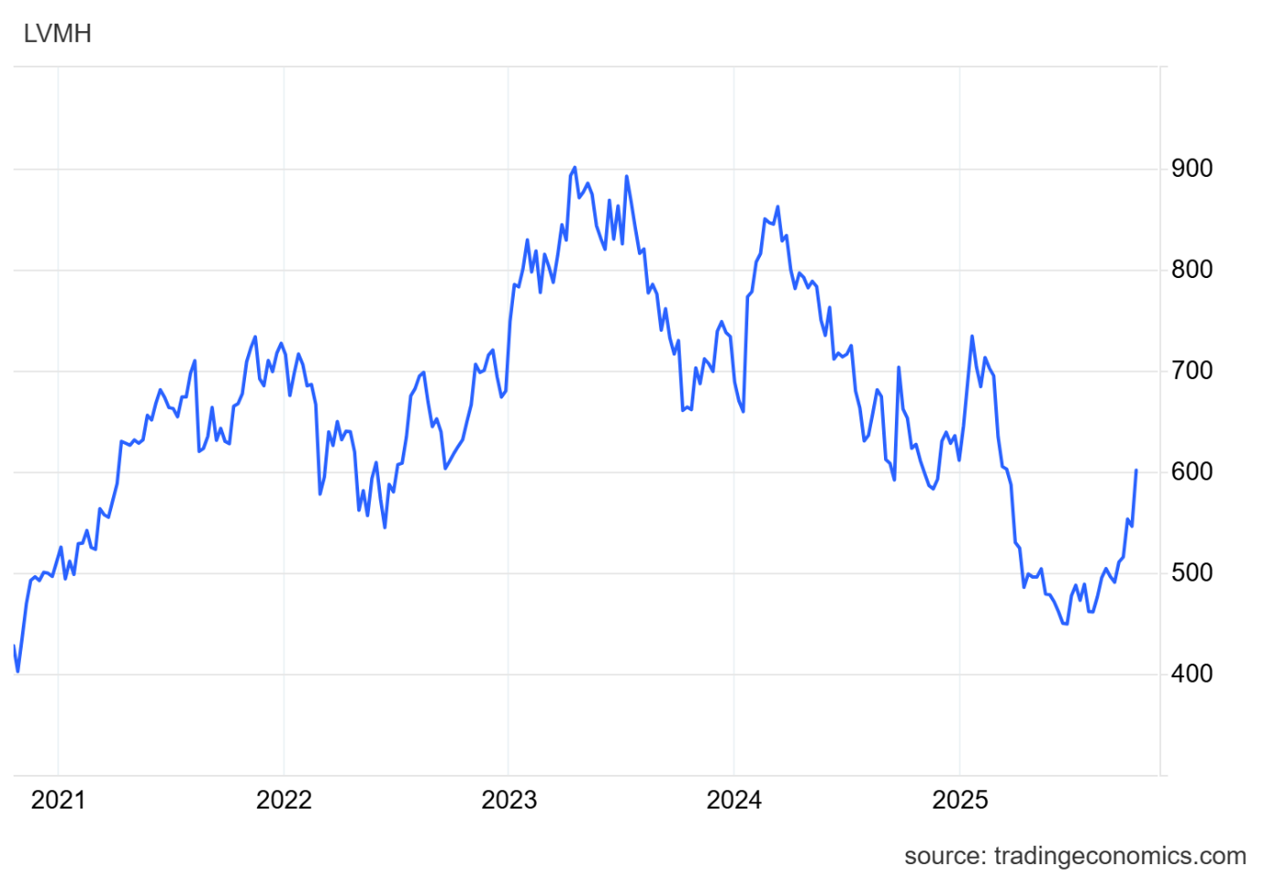 Vývoj ceny akcií společnosti LVMH by se od roku 2024 dal označit převážně jako medvědí trend, ale aktuální výsledky za třetí čtvrtletí naznačují, že by mohlo dojít k zásadní změně. Fundamentální situace, na níž do značné míry závisí konečná cena akcií, zaznamenává organický růst, což představuje potenciál pro nákup společnosti, která se na trhu pohybuje pod svým absolutním maximem – případný nárůst ceny na toto maximum by znamenal zhodnocení o více než 50 procent.