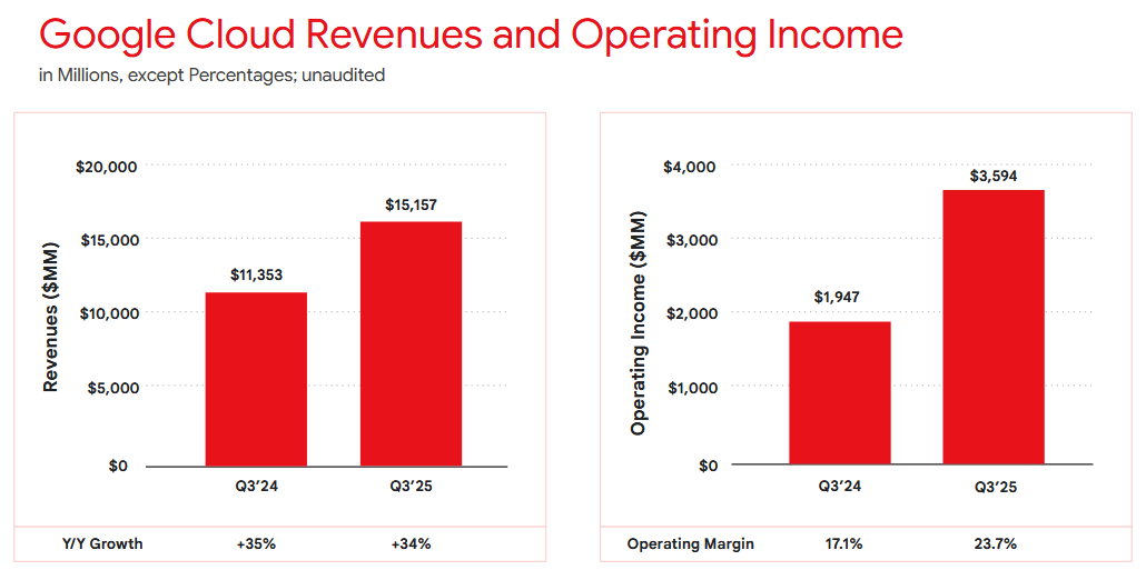 Google Cloud zaznamenal meziroční růst výnosů o 34 % na 15,16 mld. USD, což předčilo analytické očekávání. Provozní zisk v tomto segmentu zaznamenal výrazný meziroční růst o 85 % na 3,59 mld. USD. Wall Street očekával pouze 3,01 mld. USD. Minulý rok ve 3Q provozní zisk tohoto segmentu činil 1,95 mld. USD.