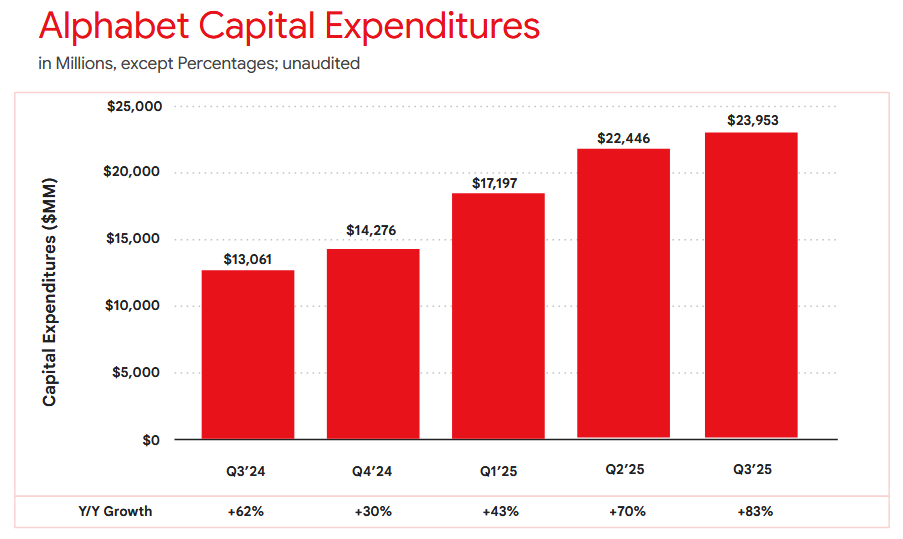 S růstem napříč celým byznysem a poptávkou od zákazníků cloudu, Alphabet nyní očekává, že kapitálové výdaje v roce 2025 budou činit 91 až 93 mld. USD. Wall Street projektoval 84,04 mld. USD. Jedná se druhé navýšení výhledu kapitálových výdajů v řadě. Již minulý kvartál navýšil konglomerát projekci kapitálových výdajů z původních 75 mld. USD na 85 mld. USD. Kapitálové výdaje v samotném 3Q činily 23,95 mld. USD při konsensu 22,38 mld. USD. Finanční ředitelka Anat Ashkenazi v konferenčním hovoru uvedla, že v příštím roce očekává výrazné navýšení kapitálových výdajů, kdy více podrobností společnost poskytne při zveřejnění výsledků za 4Q.