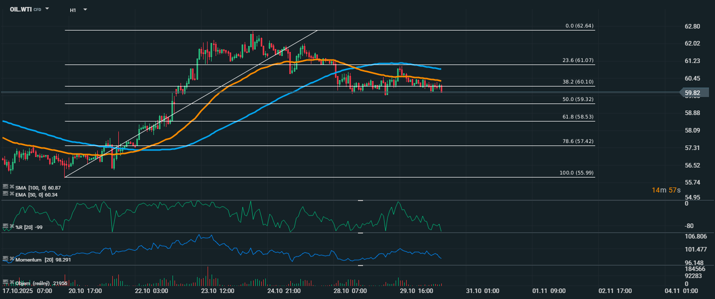Cena americké ropy WTI se nadále pohybuje v úzkém bočním pásmu kolem 59,82 USD, přičemž klíčová Fibonacciho úroveň 38,2 % na hladině 60,10 USD působí jako rezistence. Po nedávném růstu se trh dostal do fáze konsolidace a aktuálně obchoduje pod klouzavými průměry EMA 50 (60,34 USD) i SMA 100 (60,87 USD), což potvrzuje ztrátu růstového momenta. Williams %R se nachází hluboko v přeprodané zóně na úrovni -99, což může naznačovat krátkodobou šanci na odraz. Momentum ale klesá, což potvrzuje oslabující nákupní sílu. Celkově se trh nachází ve fázi vybírání zisků po předchozím růstu, a pokud cena neprorazí zpět nad klouzavé průměry, hrozí další pokles k dalším Fibonacciho úrovním – zejména 50 % (59,32 USD) a 61,8 % (58,53 USD).