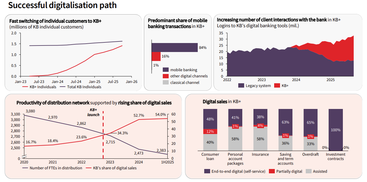 Dle managementu banka dokončuje poslední fázi migrace klientů na novou digitální platformu KB+, která byla spuštěna v dubnu 2023 - aktuálně je již 90 % klientů převedeno. Management je ohledně KB+ optimistický a věří ve významné zvýšení prodejů přes tuto platformu.