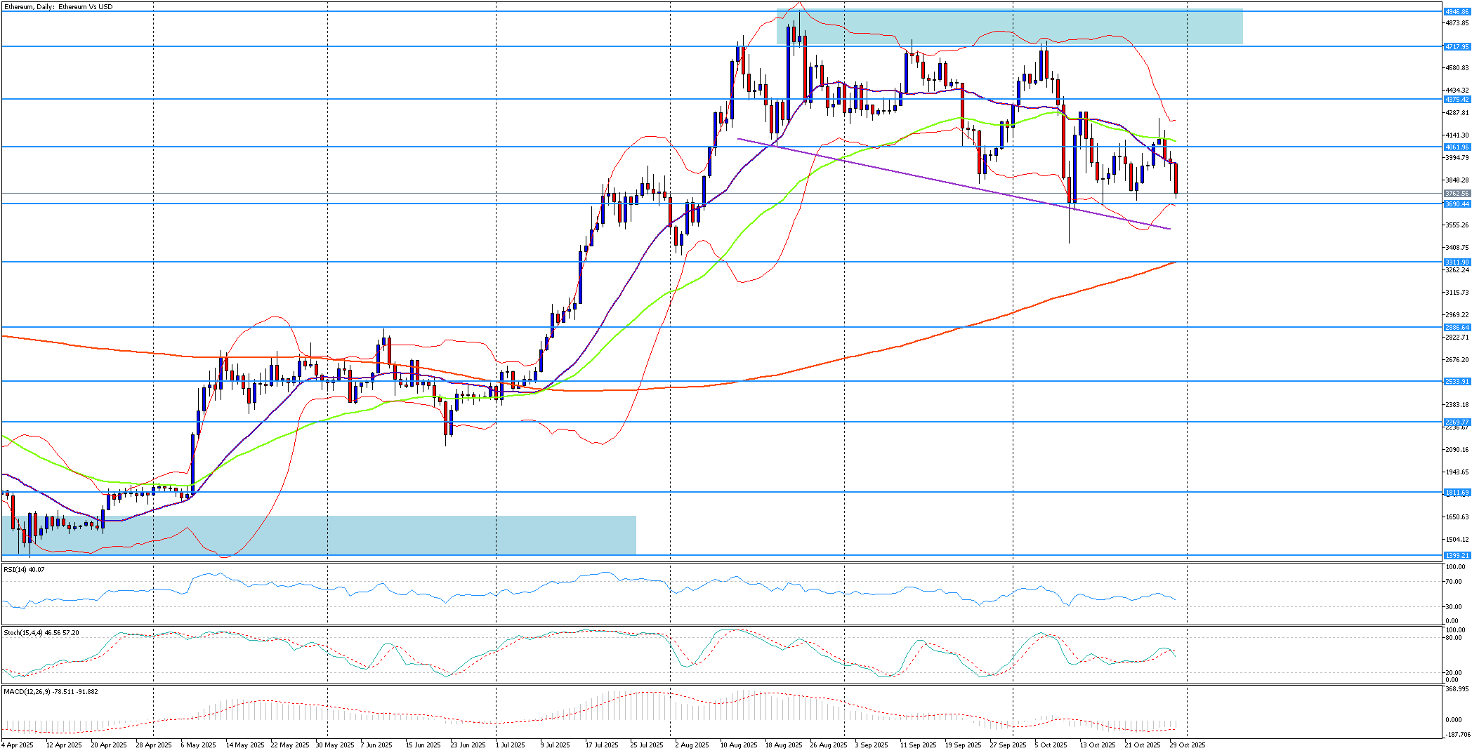 Ether (ETH) prohlubuje svůj třídenní pokles, když od začátku týdne ztratil téměř 10 % poté, co opakovaně nedokázal prorazit rezistenci 50denního jednoduchého klouzavého průměru (SMA). Neúspěšné pokusy o udržení této úrovně vedly k oslabení, které nyní stlačilo cenu pod 20denní SMA, směrem k dolní hranici obchodního pásma na 3 740 USD. Tato oblast již od září funguje jako silná technická podpora a zatím udržuje širší vzestupný trend, který se formuje od dubnových minim. Ether se aktuálně obchoduje těsně nad klíčovou měsíční zónou podpory, přičemž oblast 3 740 zůstává rozhodujícím bodem, který odděluje pokračování konsolidace od hlubší korekce. Pokud by tato úroveň neodolala, další významnou oporou by mohla být psychologická hranice 3 700 USD, testovaná již čtyřikrát v průběhu října. Její prolomení by mohlo otevřít cestu k 3 500 USD, což odpovídá srpnovým minimům a představovalo by úplné vymazání posledního růstového výkyvu. Z hlediska momenta technické ukazatele zatím neposkytují jasný směr. RSI i stochastický oscilátor pokračují v poklesu pod středovými hodnotami, což potvrzuje převahu prodejního tlaku. MACD zůstává v záporném teritoriu, avšak nad signální linií, což poukazuje na neutrální až mírně stabilizační charakter vývoje. Pokud by se kupcům podařilo znovu získat kontrolu a cena by se odrazila od spodní hranice pásma, návrat nad 20denní SMA – těsně pod hranicí 4 000 USD – by mohl být prvním potvrzením obnoveného růstového momenta. Následně by pozornost trhu směřovala k horní hranici pásma kolem 4 200 USD, kde se sbíhá 50denní SMA. Její průlom by mohl otevřít prostor pro test klíčové rezistence v oblasti 4 500 USD, odpovídající sestupné trendové linii, která byla naposledy testována začátkem měsíce.